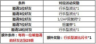 用户B活动期间邀请了11位好友,并且1位好友在活动期间达到了25级,除邀请10位好友的活动奖励“行乐型波比*3、1/2AP回复药*2、扭蛋券*1”外,还将获得额外奖励“行乐型波比闪卡*1”。