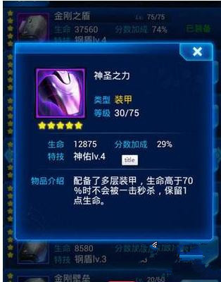 个人点评:神圣之力壁垒,这个护甲简直就是为了打BOSS而生了,因为游戏到了后面BOSS的秒人能力非同一般,基本上中标了就得死,这件装备可以跟你保持70%的血量,妈妈再也不用担心我被BOSS秒了,只不过最对付满屏幕子弹的时候稍微有点鸡肋,不过僚机搭配好,一样没问题