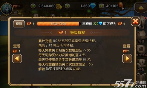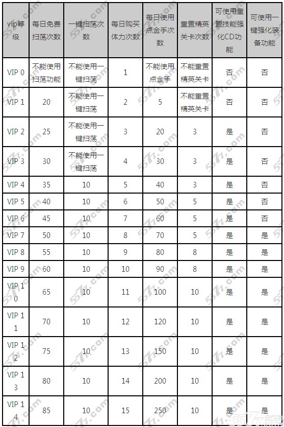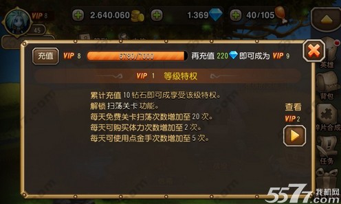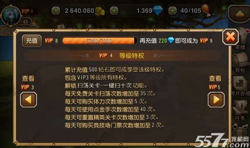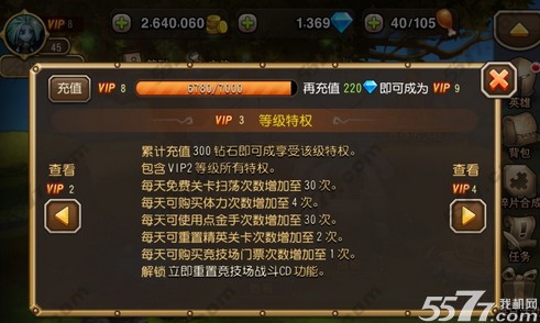 增加扫荡关卡-一键扫十次的功能,而且在购买体力,扫荡关卡,点金手指,购买精英关卡次数和竞技场门票都大有所涨,而且只要充值50元,就可以享受VIP1至4的功能。