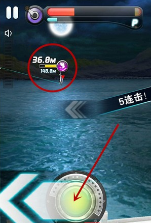 1、游戏中的箭头会在我们要钓的鱼出水后给出提示,玩家要做的就是按住下面黄色的圆,然后向左边滑动,就能拽住鱼啦~!