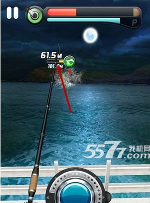 2、每当拽线成功,我们钓的鱼体力就会损耗,然后我们就慢慢的收线,接着就可以把鱼钓到啦。
