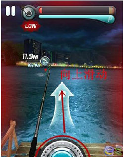 3、抓住时机施放大招。如图所示,按住蓝色的圆圈,顺着箭头向上滑动,这样就能用力把鱼拽一下,加快速度把鱼钓上来,这样一来玩家们就可以轻松的将大鱼钓上来了。