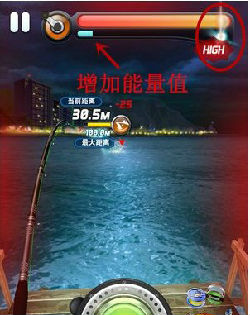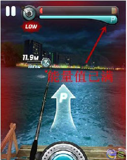 1、一定要收集能量,每次拉满鱼竿时玩家就能获得一些能量,如图箭头指的蓝色能量槽代表着玩家目前获得的能量,能量可是个好东西哦,有了能量你就有了钓大鱼的资本了哦。等到积满能量。当蓝色的槽满了就代表着玩家已经积满了能量,这时候就可以放大招了,无数大鱼在等着你哦。