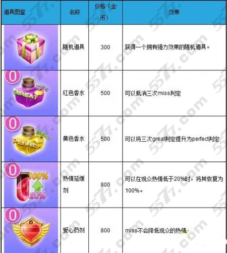 在巡演的时候道具选择:随机道具为300/个,可以随机出下图中的一些道具,比较推荐,热情延缓剂也是不错的选择,在观众热情度低于20%的时候,可以将热情度可以回升到100%。使用爱心药剂,出现miss的时候不会降低观众的热情度,也比较不错,所以建议平民级玩家先升级到20级,然后利用系统送的钻石和金币来快速升级。每局的经验是非常多的。