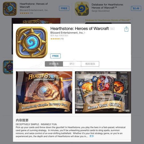 第三步,使用AppStore搜索炉石传说,因为你所在的是英文地区,所以要搜索“Hearthstone:Heroes of Warcraft”,或者搜索“Blizzard”,然后找到旗下的“Hearthstone”游戏并下载!
