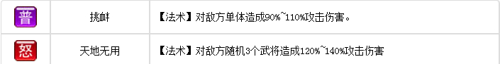 在来看看技能的部分,普攻显得很平常,怒气技能天地无用对敌人随机3个武将造成伤害,因为没有什么指向性而且不附带减怒气或者施毒等技能这个技能就显得很平常了。
