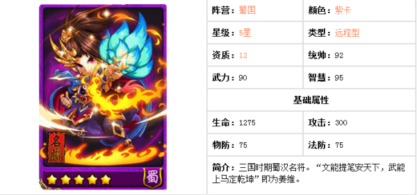 小编总结:姜维这个英雄在资质12的紫色将卡中是属于比较普通的一类,跟其他12卡没有什么太大的优势,但是作为小伙伴来说,姜维可以配上各国的羁绊,如果你抽到姜维还是留一留因为是不错的小伙伴人选。