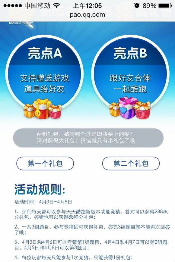 天天酷跑第三日新版本竞猜赢积分礼包的答案是什么?这是最近关于新版本推出的特别活动,赢了的玩家可以获得288积分,猜错也有88积分!那么几天的答案是什么呢?