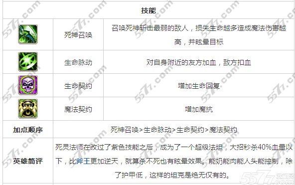 死灵法师的大招伤害非常之高,配合骨法的3技能放逐,打出上万的伤害完全没有问题,这可是成百吨的伤害!!!也可以配合火女、恶魔巫师等单体高爆发英雄,作为后续的补刀选择。不过死灵法师的护甲较低,面对物理攻击的菜刀队很不够看,随便砍死,最好在前排顶一个像抄袭、斧王之类的纯肉盾。
