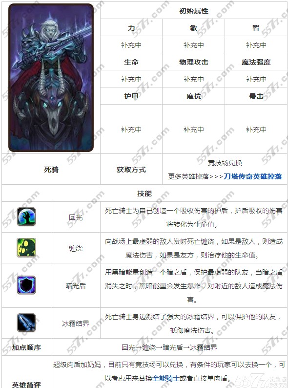 这个英雄是超级肉盾加奶妈,目前只有竞技场可以兑换,有条件的玩家可以去换一个,可以考虑用来替换全能骑士或者直接单肉盾。