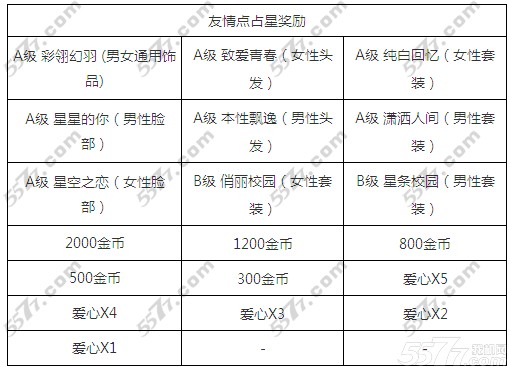 钻石占星玩家可以花费100友情点/1次,500友情点/5次,1000友情点/10次,友情点占星有机会获得永久的A或B级装扮~还有金币和爱心哟。