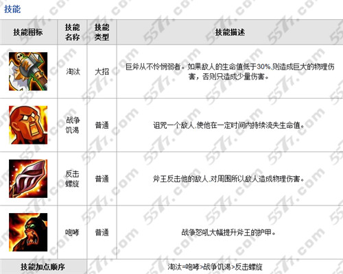 斧王是一个前排肉盾,可以对敌人发起反击,大招淘汰技能可以将生命值低于30%的英雄击杀。战争饥渴可以诅咒敌人造成一定的伤害,反击螺旋可以对敌人造成反击,伤害巨大。在当肉盾的时候,使用咆哮技能可以抵挡住敌人的一波集火,所以淘汰和咆哮技能是比较给力的。