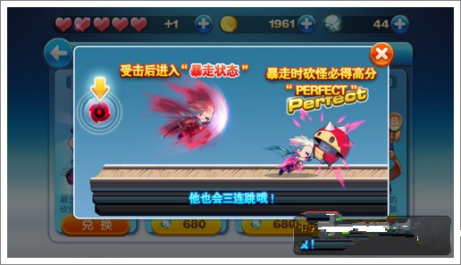 在里约的进击版里面原本在急速模式和经典模式里面的下滑键,在这个模式里面变成了攻击键,遇到来拦路的敌人就是一顿猛揍,但是这些以揍敌人的方式来得分也不是没有标准的,有Perfect、Great和普通攻击3种得分的标准,Perfect的分数是最多的,依次来看普通攻击的得分是最少的,所以能攻击敌人也不要在屏幕上一通乱点哦。