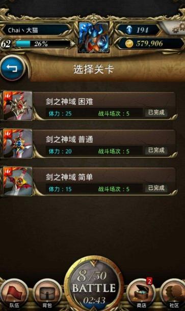 战场中有三个等级,简单,普通,困难。耗体分别为:15,20,25.需要说明的是中剑攻击为900,大剑攻击为2300.基本上每回合攻击,运气好,刚进图的时候为2CD,之后仍旧每回合攻击。