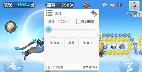 小编帖吧看见有玩家说用葫芦侠减速的方法来完成这个任务,然后小编就下载了葫芦侠(点击下载)来用,果然跑了5次就完成了后面3回888。具体操作,开葫芦侠后,进入PK场,经典赛,前面距离尽量控制下面金币槽的增长,然后在680米~800米之间进入超级奖励,在超级奖励中因为不需要躲怪,和躲坑,所以安心的用葫芦侠减速到最低,然后看着米数慢慢涨到888米时按下手机的home键退到手机桌面。最后,点游戏进入,此时游戏画面暂停中,若你的手感好,刚好停留在888米,这个时候你可以点排行榜或重新开始直接结算游戏了。结算时直接888米完成。