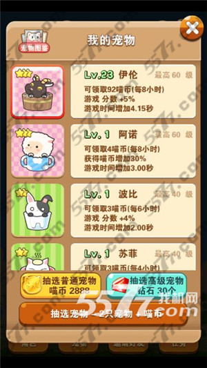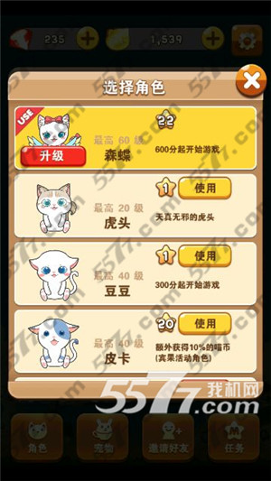 可以看到,假如您是技术党,升级角色是你的不二选择,因为宠物二十级之后并不增加加成,宠物到二十级以后增加的只有喵币收入。那么假如你的技术不怎么样那就升级宠物吧,更多的喵币带来更多的道具,让你能得到一个好的分数。