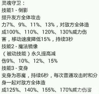 二技能(变身):使灵魂守卫变身恶魔形态,每次普通攻击时都将和分身一起对敌方全体造成伤害.这个技能就是大家争论的焦点,普通攻击为全体攻击,同时拥有分身一起攻击!