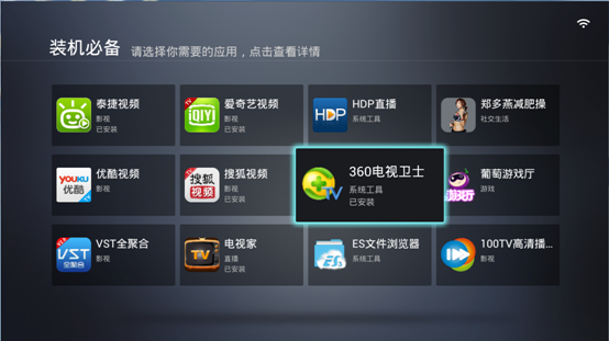 图2:360电视助手装机必备页面,精选体验最好最值得安装的应用推荐给用户