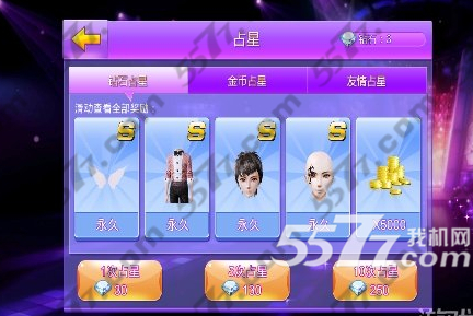 1、许多玩家都反映钻石占星的概率太低,10000多钻石全部投入占星,其结果全是金币,都够买2个588888,所以抽永久极品道具概率确实比较低