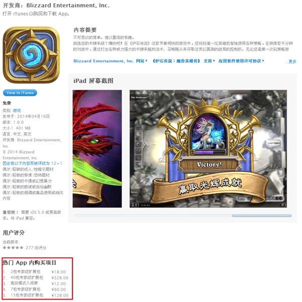 iPad版《炉石传说》今天正式登录国内iTunes Store供玩家免费下载,不过与PC版一样,iPad版本游戏中也存在卡包内购项目,现在各项费用已经判明。
