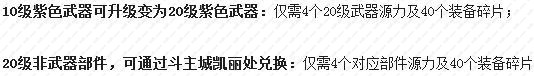 接着,就是大家比较关注的紫色武器升级的条件,上面已经说明了所需要的装备碎片,还有多少武器源力的说明,不知道兑换位置的亲,可以去主城凯里那里兑换!