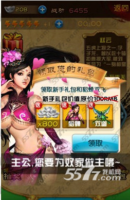 游戏提供了新手礼包,获得礼包可以得到800银两外加貂蝉角色刚和双幽武器道具,但是点击领取后发现居然需要10元人民币。
