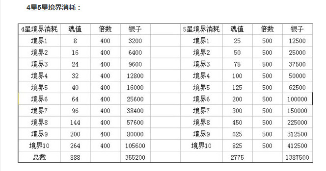 我想一星二星的融魂大家应该都见过,下面我给大家看看4星到5星的融魂值是需要多少魂值的