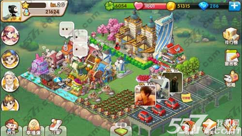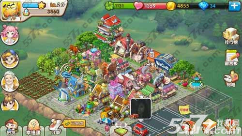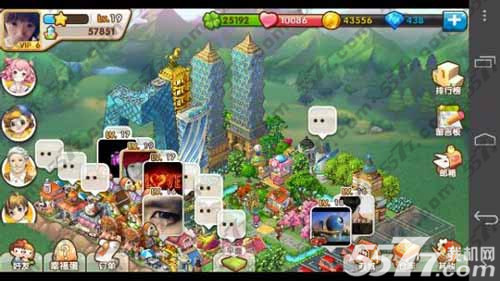 玩家可以通过这个界面编辑自己的小镇格局,增减移动各类建筑,收获生产完成的果实产品等。主界面的左上角为玩家信息,包括玩家等级及城市繁荣度等;而玩家信息下方则是小镇任务提示,小伙伴们可以通过点击角色头像查看任务以及完成情况。而主界面的右上方则是小镇/镇长的各项指(财)标(富),包括绿化度、爱心(用于扩地、购买建筑等,通过与好友互动获得)、金币、钻石。另外,玩家还可以通过主界面边上的各项选项查看相应的信息以及选择需要的功能。