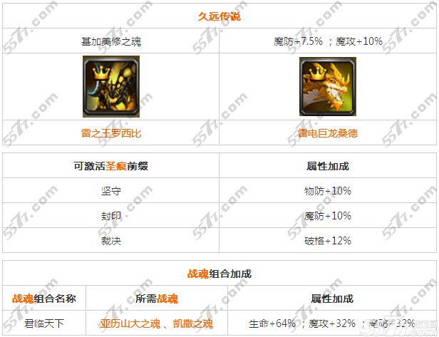 而该战魂搭配【亚历山大之魂、凯撒之魂】可激活生命+64%、魔攻+32%、魔防+32%的强力属性。具体图片如下: