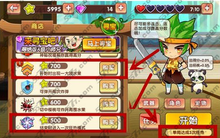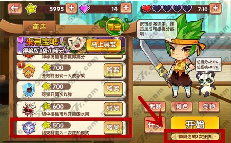 2、玩家们不要着急,商店里面为我们通关准备了一些道具,如下图标记的红色框中的道具,玩家可以购买“开始时出现一大波水果”和“结束时进入一次狂热模式”这两个道具。花费1200金币购买2个道具可以让我们快速的完成任务。开始时出现一大波水果,我们在切的时候,很容易就能达到20000分,进入狂热模式。