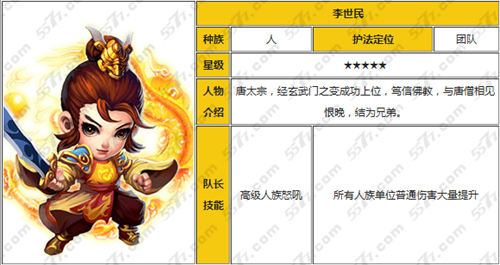 迷你西游李世民是一个高级人族英雄,队长技能是“高级人族怒吼”,可以增加队伍中人族英雄的伤害。