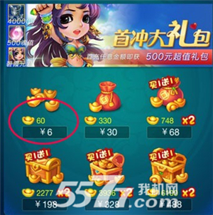 3、如下图的充值界面,玩家选择想要购买的元宝数量,充值6元,就可以获得迷你西游VIP等级1、并获得60元宝