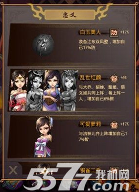 乱世曲中忠义满足一定的条件,可以获得相应的增益效果。忠义根据武将的本身的故事,为每个人设计了相应的忠义,可以是和装备、技能、其他武将相关,达成相应的忠义就可激活属性加成。
