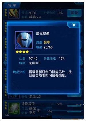 魔龙壁垒一看就知道强力,特别在后期和皮糙肉厚的BOSS对耗时效果尤为显著,虽然没表示每秒能恢复多少,不过绝对好用,只是获得难度有点高,是作为玩家战机装甲的最强者。