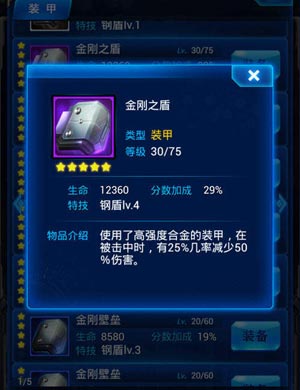 钢盾:使用了高强度合金的装甲,在被击中时,有25%几率减少50%伤害(技能LV4时效果)