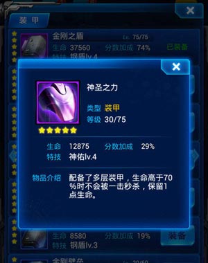 神圣之力有很奇妙的技能效果,简单来说就是防秒杀,这个效果或许在前期不太明显,因为能秒杀的人的BOSS并不多见,而到了后期,这类敌机就开始频繁出现,是可以作为应付特定关卡的装甲。