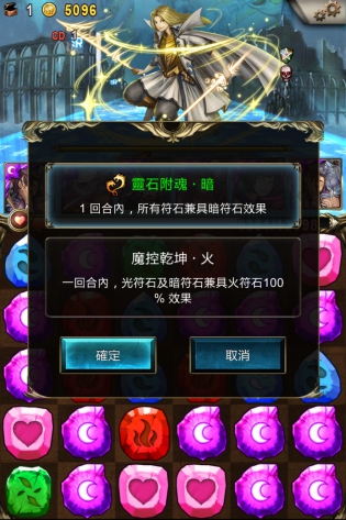 如「灵宝天尊 ‧ 通天教主」与「猫公爵 ‧ 费利克斯」同队,两者主动技能同时刷新可以发动,即可解放组合技能「灵石附魂 ‧ 暗」,所有符石包括心符石兼具暗符石效果。