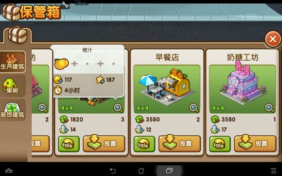 接下来是第二种类型的建筑 那就是基本没有发展前途的。举个例子。比如前期的牛奶店和鸡舍 生产出来的物品后面会有需要,但是如同橙汁和鸡蛋灌饼,今后没有建筑会用到,这俩货就不推荐多建,两个用来完成任务就够了