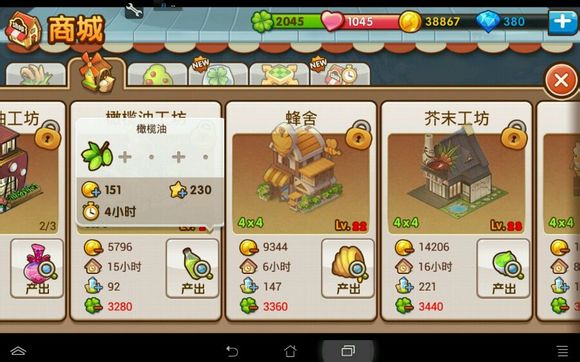 在最后强烈推荐两个建筑,蜂巢和橄榄油厂这俩货不仅生产时间很长,更令人发指的是,在我查看后期的各种建筑时,有好多建筑都需要蜂蜜和橄榄油!!还有更更坑爹的是,橄榄树成熟的时间也要六个小时! 唉,说多了都是泪。
