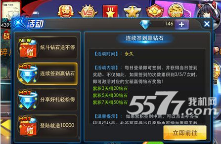 天天炫斗签到系统每天都会给玩家送一些钻石或是金币作为福利,所以动下手指,登录游戏就可以获得金币。签到累积3天、5天、7天的时候都会送出钻石, 其它几天都是金币。