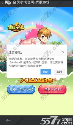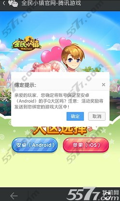 5、如你已确认所选大区无误,请点击“确定”,【注意】请谨慎选择游戏大区,每个游戏账号只能领取一次奖励,并且奖励将发送至所绑定大区,如若绑定大区有误,请点击“取消”重新进行绑定再领取奖励!