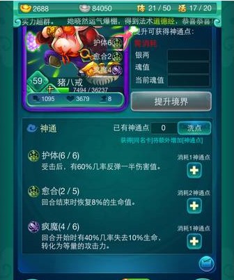 迷你西游飞升要求境界满神通满,每一张同名卡提供2点神通点,例如:10层境界的紫护法(如:八戒、沙僧、白龙)要想神通满,还要刷4张紫护法(如:八戒、沙僧、白龙)。