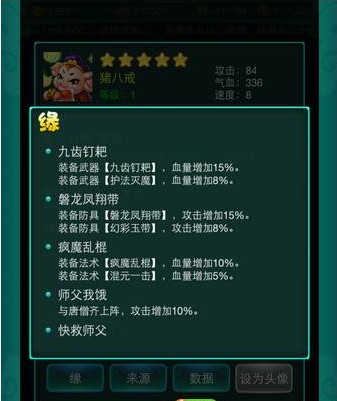 装备武器【九齿钉耙、护法灭魔】,血量增加15%、8%;