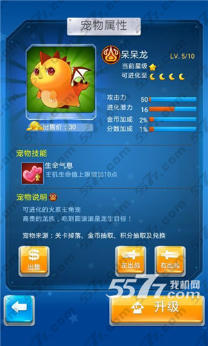 大家如果需要升级宠物的话就如上图点击 升级 宠物升级大体上是这样:从一星开始把宠物经验吃满到一定等级 然后就需要进化至2星,这时候你就需要进化卡和若干金币去进化,星级宠物的话进化都是这样,到月亮宠的时候进化就需要一只相同属性的月亮宠(级别不限)+进化卡+若干金币(如上图是一只火属性的宠物,那么当你把1月亮升级到45级的时候就需要一只火属性的月亮宠+进化卡+若干金币去进化,进化完成之后它的最高上限等级就会变成50级,2月亮到4月亮都是依此类推)
