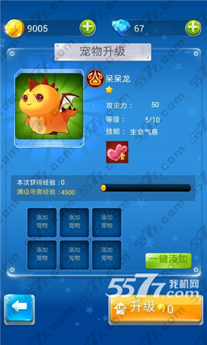 当要给宠物升级经验的时候 大家点开升级面板可以发现,会有6个空格去添加宠物,和一键添加(如下图)而一键添加系统默认只会添加经验卡和低级不可以进化到月亮级别宠物,当大家需要吃掉高级宠物或者月亮级别宠物的话就要点击,6个空格去添加宠物,(宠物等级越高吃掉之后升级的经验就越多)当把需要用掉的经验卡和宠物添加完成之后界面会显示,本次你一共可以获得多少经验,而在(本次获得经验)的下面有(满级所需经验)(如下图)这个满级所需经验是指在没有进化的情况下你升到满级所需要的经验。