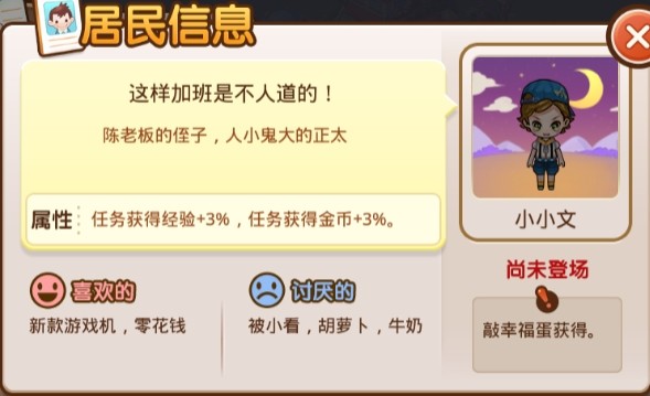 小小文是游戏中新增加的一个居民,它的身份则是老板的侄儿,一个似乎很小但是绝对鬼点子比较大的小小正太噢~!介绍完它的身份,我们再看看它有什么样的属性吧!