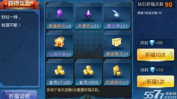 首先每一次祈福需要耗费的钻石数量10。抽取采用两种方式1.手动点击抽取一次。2.贵族专享的祈福10次连抽可以节省10砖石。