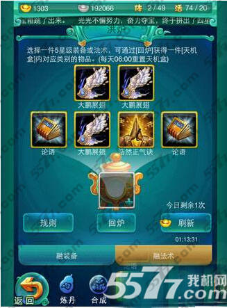 进入画面的时候是不是很想抽奖系统,其实这个熔炉系统,还可以免费获得元宝呢。只要四个图案一样的就能免费获得100元宝,五个图案一样的获得300元宝。烘炉内的6个天机盒在每日早上6点自动刷新,如果有需要的装备法术,请尽快兑换。