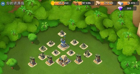 对于十九级这样的新手前期资源岛抢占成功后,我们推荐的防御阵型就是围堵模式,这样能够确保该木材资源岛为自己所用。特别提示的是,各防御设施之间的间距非常重要,望玩家慎重考虑。