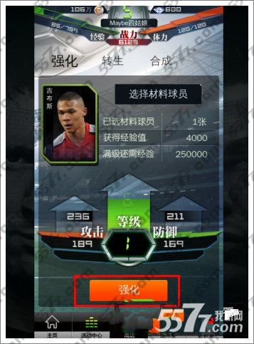 点击要强化的这张卡牌之后,在球员卡详情的右翻第二页上点击“强化”键即可进入球员强化界面,接着点击“选择材料球员”即可选择被吞噬的球员,开始升级,升级很快就完成了。